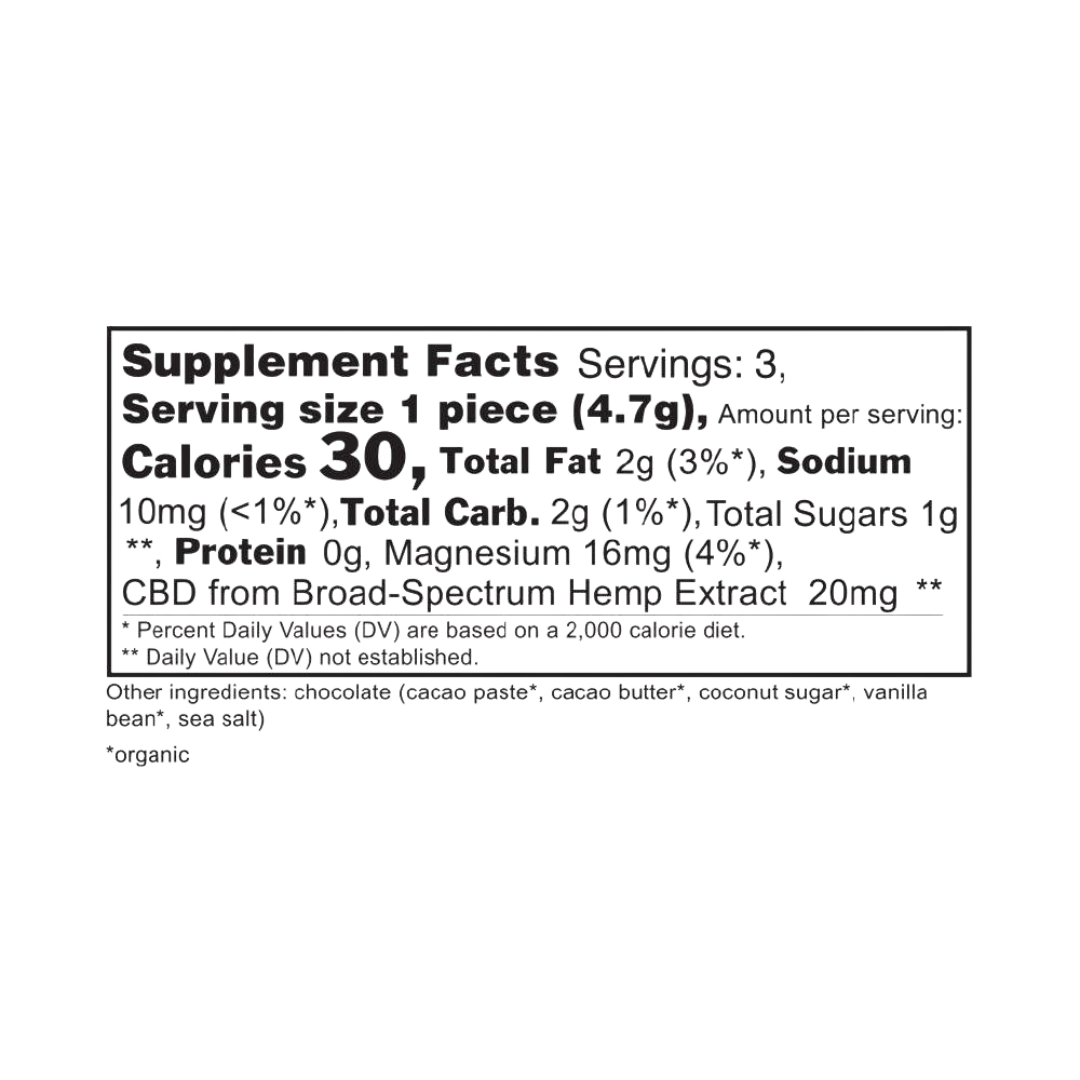 cacao paste*, cacao butter*, coconut sugar*, cannabinoid-rich broad-spectrum hemp extract, vanilla bean*, sea salt