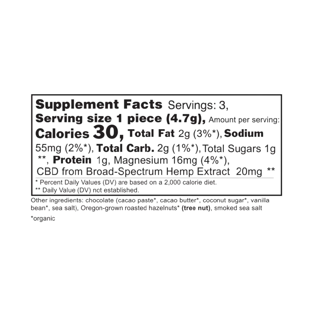 cacao paste*, cacao butter*, coconut sugar*, cannabinoid-rich broad-spectrum hemp extract, Oregon-grown roasted hazelnuts* (tree-nut), vanilla bean*, sea salt