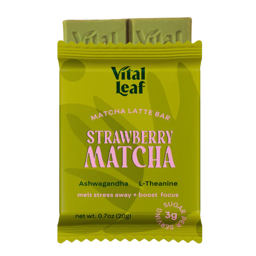 Enhanced with adaptogens to melt stress away, the Strawberry Matcha bar brings you to the present moment with a calm state of mind and greater balance. Each bite evokes the satisfying flavor of your favorite matcha latte, sprinkled with summery sweet and tart strawberries.