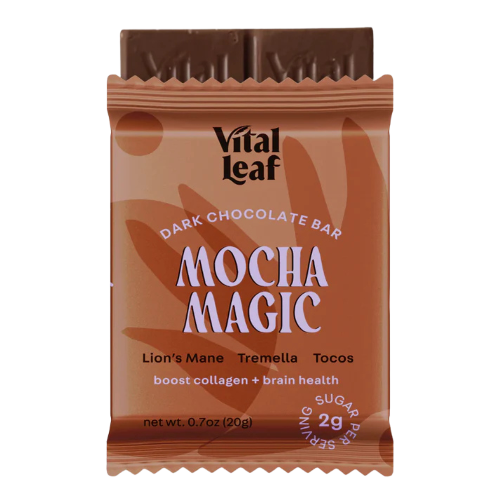 Enhanced with cognitive, longevity-supporting mushrooms and a powerful plant-based collagen booster, the Mocha Magic bar protects the brain, promotes neuron connectivity, and nourishes the skin and connective tissues. Each decadent mochaccino bite awakens your senses with the perfect brew of rich cacao and dark roast coffee.